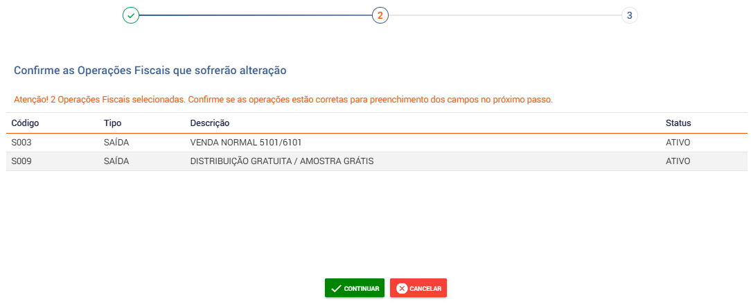 Marque as operações que deseja alterar e clique em Continuar.