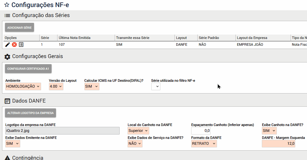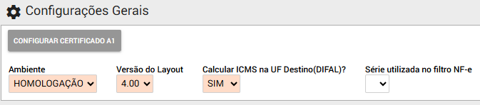É necessário configurar os campos apresentados no quadro e realizar configuração do certificado digital A1.