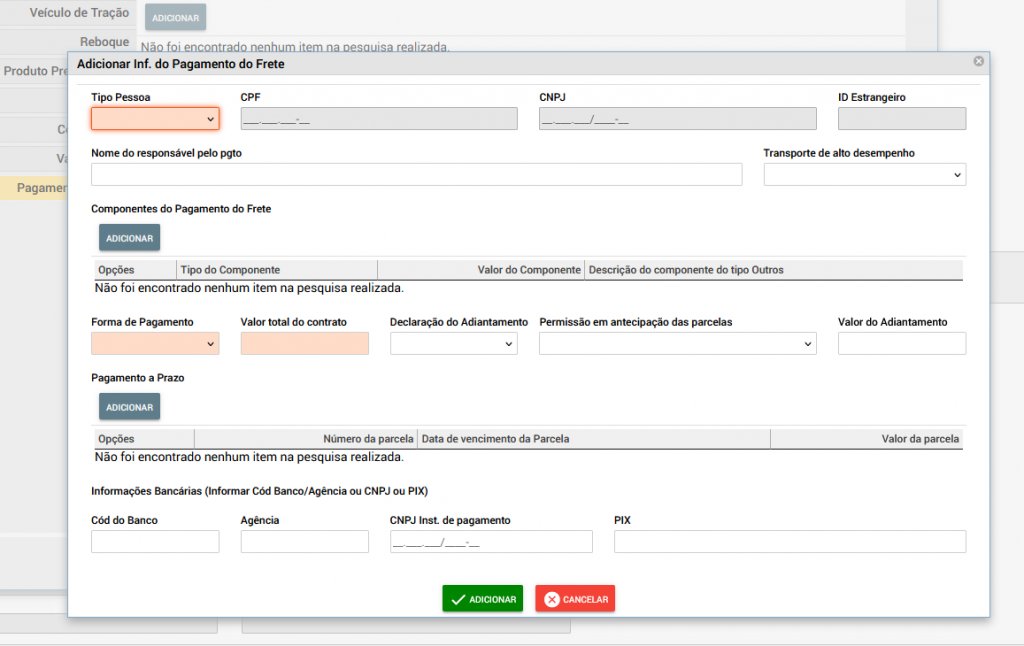 Será exibido aba “Pagamento do Frete”, para ser informado os dados do pagamento do frete, forma de pagamento e dados bancários.
