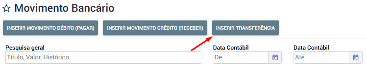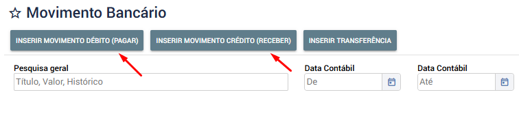 É possível inserir : Movimento de Débito (Pagar), Movimento de crédito (Receber) ou Transferência.