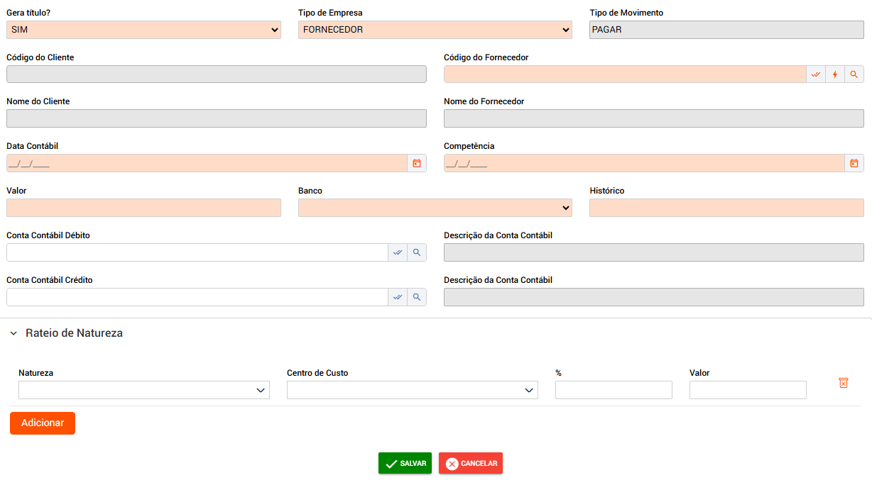 Além desses campos obrigatórios, tem outros que podem ser informados, como a conta contábil.