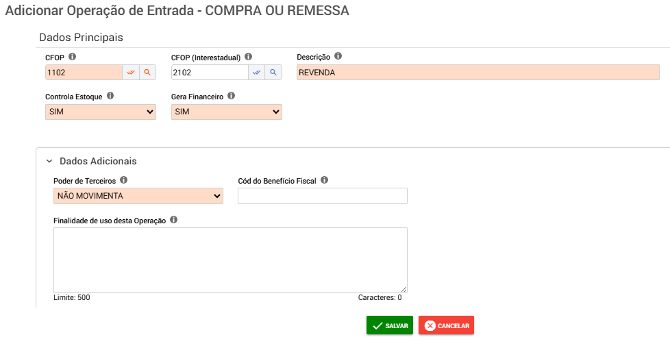 Após revisar e preencher todos os campos necessários, clique em Salvar para registrar a configuração da Operação Fiscal.