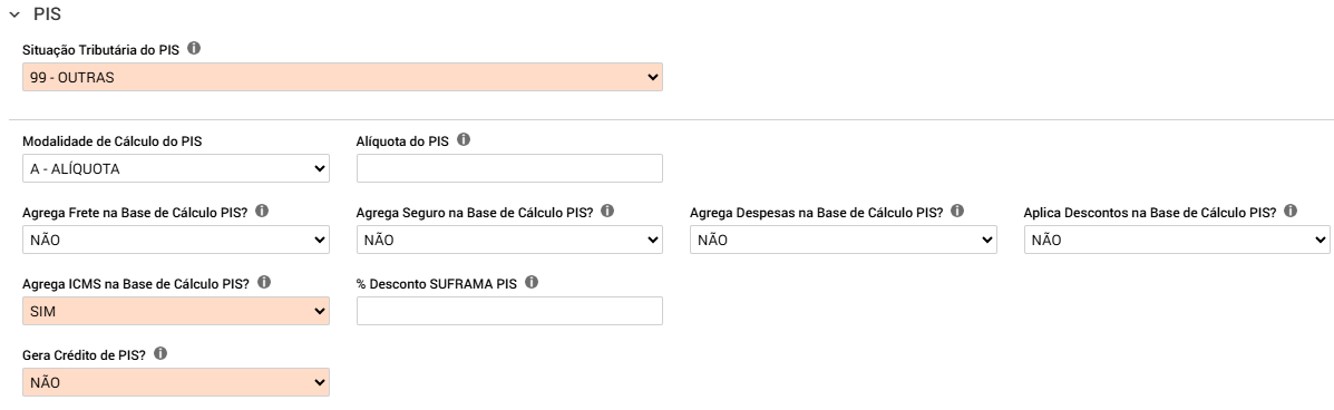 A- Alíquota: o campo Alíquota do PIS fica disponível para preenchimento.