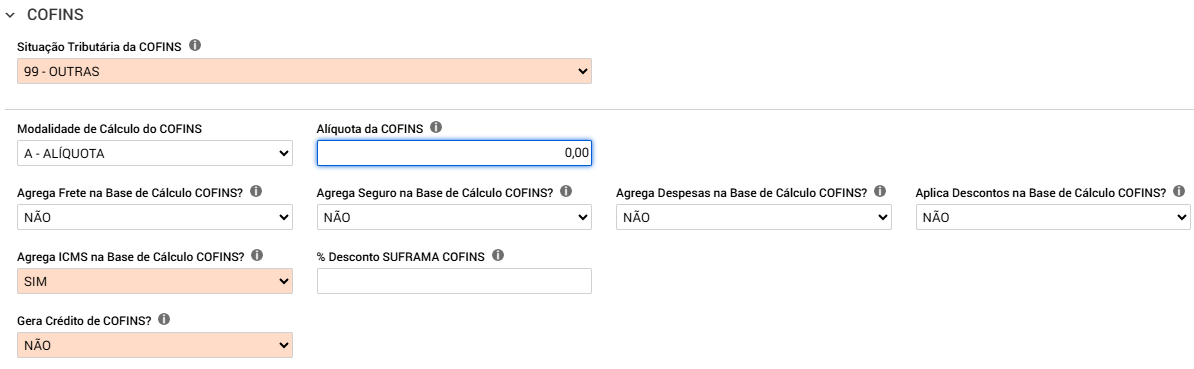 Selecione a forma de cálculo da COFINS.